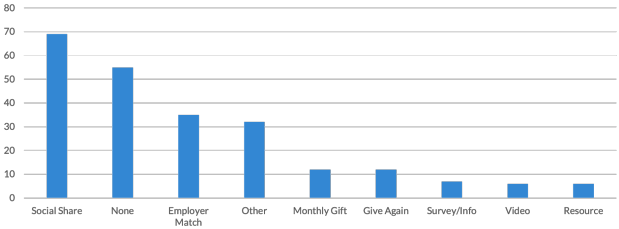 Good donation pages should facilitate a good conversation. The most popular is having Social Share buttons. Milaap has Facebook and Whatsapp. The crowdfunding organization has messaging integrated with Whatsapp and it also believes both these platforms drive more engagement for the platform. Social sharing is also the most preferred choice by organizations. But at the same time 55 organizations offered no next action. This is a lost opportunity.