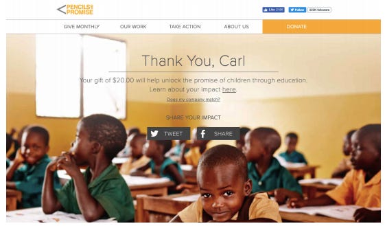Some Nonprofit organizations are using the thank you page as a mode of a survey. The idea is to collect user information on the process and experience. This is an untapped feature; people want to be heard so it can be a great exercise on getting user feedback.